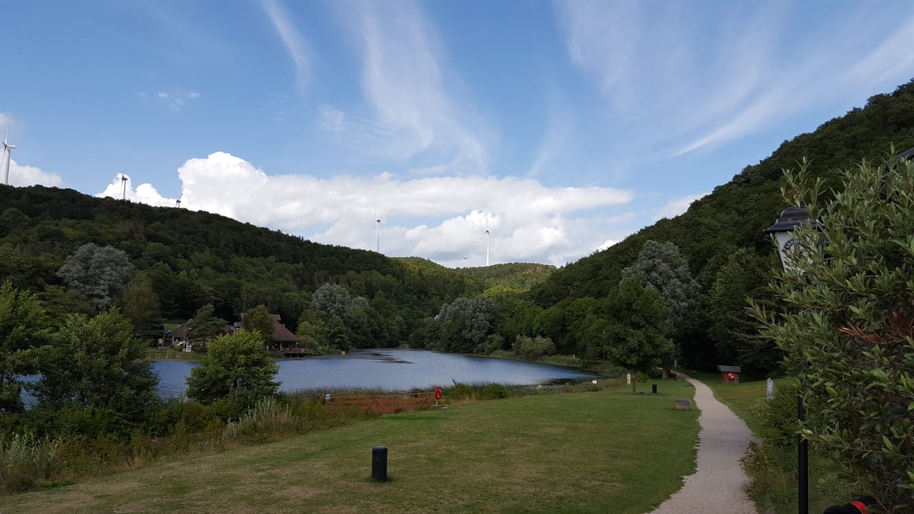 Nach unserer Rückkehr bestiegen wir die Brohltalbahn, bei der es sich nicht um einen normalen modernen Zug handelt, sondern um eine altmodische Bahn mit Holzbänken, Holzverkleidung und Schiebetüren. Wir fühlten uns alle in glückliche alte Tage zurückversetzt. Sogar einen richtigen Schaffner mit blauer Weste, blauer Mütze und Ledertasche gab es, der mit seinem Getränkewagen nicht nur eifeltypische Getränke verkaufte, sondern uns mit seinen Scherzen und lockeren Sprüchen zum Lachen brachte. Zwischendurch genossen wir immer wieder den Ausblick in die herrliche Eifel mit ihren wogenden Getreidefeldern, Büschen, Bäumen und Blumen. Fast vierhundert Höhenmeter überwanden wir und blickten entweder vom Tal hinauf in die Höhen oder von hoch oben hinunter ins sonnenbeschienene Tal.